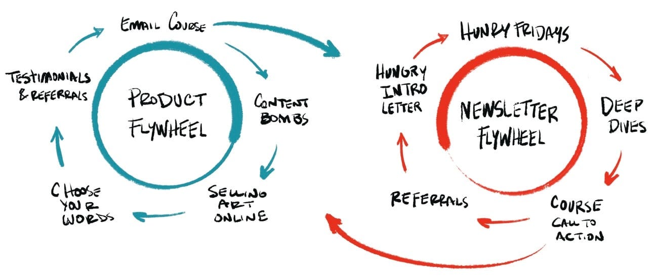 That graphic shows the potential of the things I’m working on and how they will eventually work together and hopefully become self-reliant as things grow. At first, the wheels require a lot of hand turning to pick up speed, but over time, the momentum carrying them will require less work on my part. That means I get to spend more time doing creative work and engaging with others.