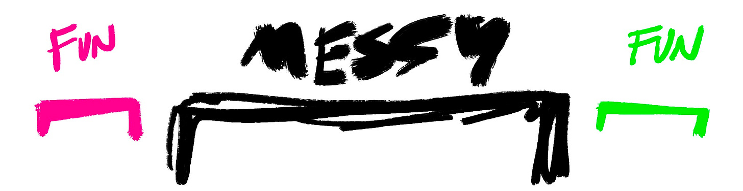 That gap is what Scott Belsky, founder of Behance, refers to as The Messy Middle, the parts between the good stuff. It’s the work we slog and stumble through reluctantly, begrudgingly, to get our work in the hands of others and receive the greats of all dopamine hits, the cha-ching sound from our mobile device signifying someone bought something.